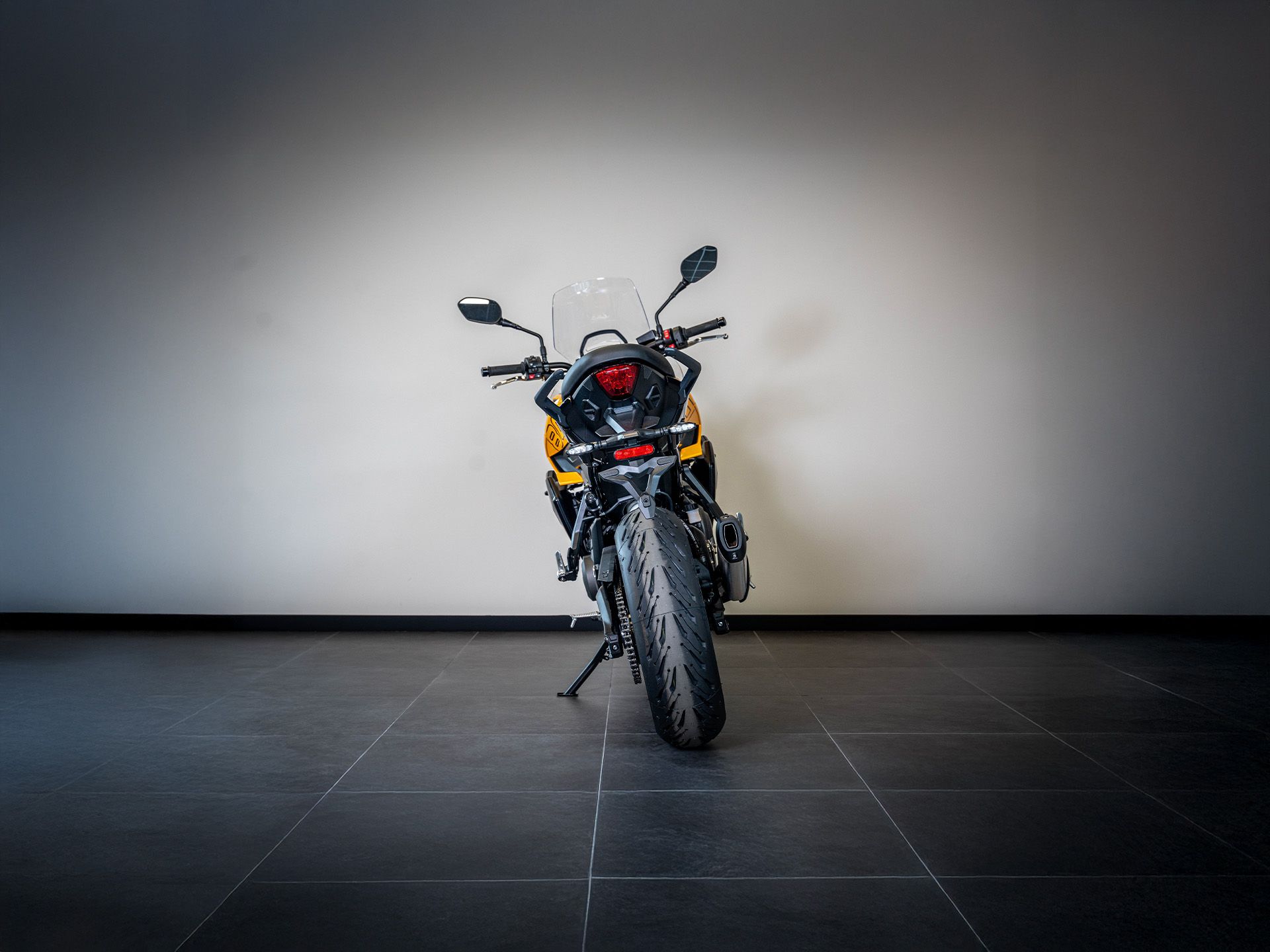 Suspension arrière : Mono-amortisseur Showa avec détente réglable et réglage de précharge hydraulique à distance, débattement de 150 mm.
